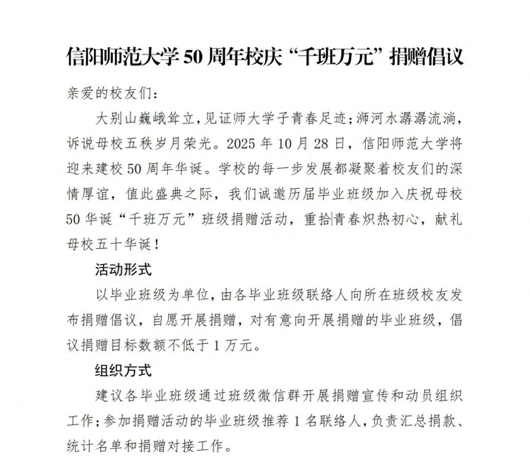 近日,信阳师范大学针对往年毕业生发起50周年校庆“千班万元”捐赠倡议。倡议书清楚,10月28日,信阳师范大学将迎来建校50周年华诞。